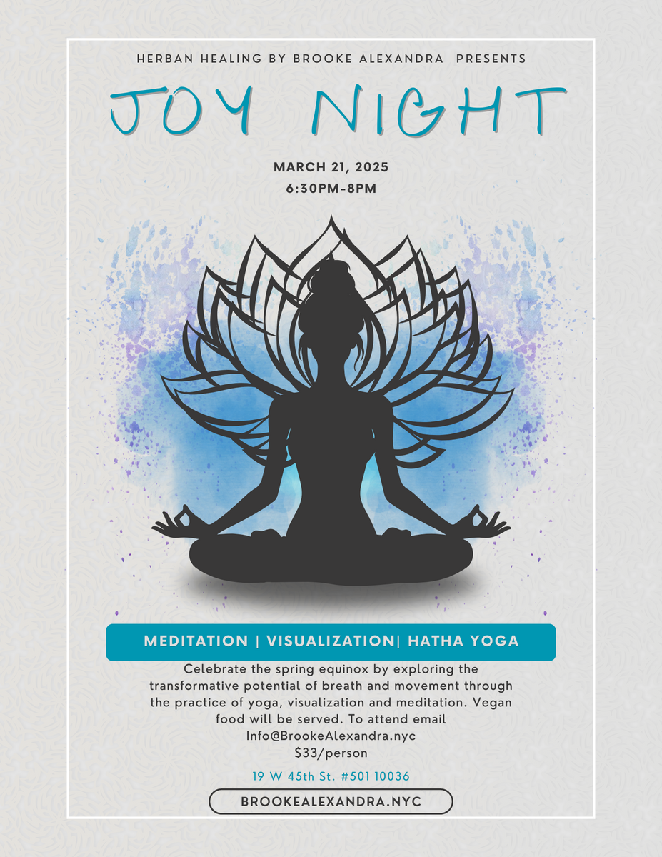 Join us this Friday at "Joy Night" as we usher in the spring equinox with a fun-filled night of visualization, meditation and yoga. Email info@brookealexandra.nyc to attend.